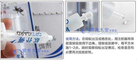歐撲得滅蟻膠餌使用方法很簡單,在螞蟻經(jīng)常出沒或棲息處,用注射器將餌膠直接投放在邊角、縫隙或裂痕中,每平方米施1--2點,隨時觀察螞蟻出沒情況,檢查是否有必要再次投放膠餌。