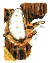 白蟻境,有翅成蟲飛離群體時(shí)都有趨光習(xí)性。臺(tái)灣乳白蟻、黑翅土白蟻常在傍晚分群,飛離群體的有翅成蟲具很強(qiáng)的趨光性;黃翅大白蟻在凌晨,月光明亮?xí)r進(jìn)行。所有的有翅成蟲都明發(fā)育完善的單眼和復(fù)眼,和其它許多昆蟲一樣,對(duì)光有強(qiáng)烈的正反應(yīng)——趨光性。因此,白蟻有翅成蟲飛離舊群體,建立新群體,光是不可缺少的重要條件。土壤除木棲性白蟻與土壤不直接發(fā)生任何關(guān)系外,土木棲白蟻和土棲性白蟻跟土壤的關(guān)系都極為密切,特別土棲性白蟻,無土不成巢,離開土就生存不了,土棲性白蟻對(duì)土壤有嚴(yán)格的選擇。土壤也是土木棲白蟻的蟻巢、蟻路的主要成分。白蟻之所以能在地球上生存二億五千萬年歷史,除具有適宜其生存的食宿條件和自身的營群落性生活特性外,很大程度上決定于白蟻的繁殖能力。白蟻的繁殖靠群體中的蟻王和蟻后這類生殖性的個(gè)體,尤其是蟻后,有極其膨大的腹部和發(fā)育完全的生殖器官,主要起交配產(chǎn)卵的作用。蟻后和蟻王在整個(gè)巢群中數(shù)量最少,但作用卻十分重要,一旦失去生殖性的巢群,必定要有新的補(bǔ)充型生殖蟻,否則這樣的巢群不僅無法擴(kuò)展群體,繁殖后代,而且整個(gè)巢群將無法協(xié)調(diào),最后失去控制,直至毀滅整個(gè)群體。[2]繁殖白蟻的巢群中一般只有一對(duì)原始型蟻王和蟻后,某些